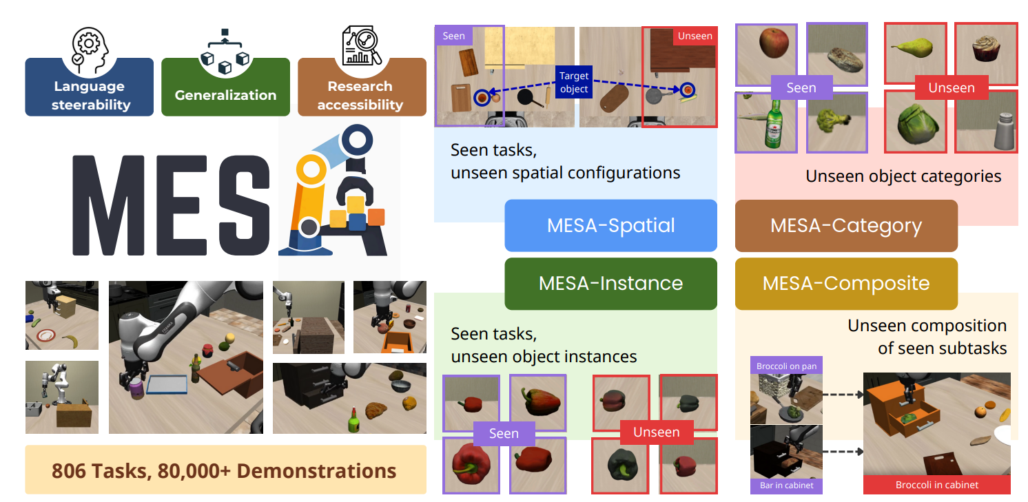 Welcome to MESA, a dynamic evaluation framework designed to probe language steering and precisely measure language-conditioned policy generalization. Our framework includes MESA-Gen, a pipeline for scalable task and demonstration generation built upon substantial improvements to MimicGen. We also provide MESA-Bench, a benchmark designed to probe generalization to unseen spatial configurations, object instances, object categories, and subtask compositions for tabletop manipulation tasks.